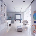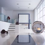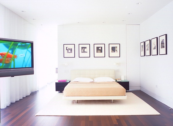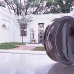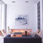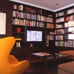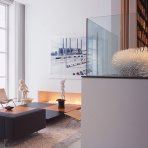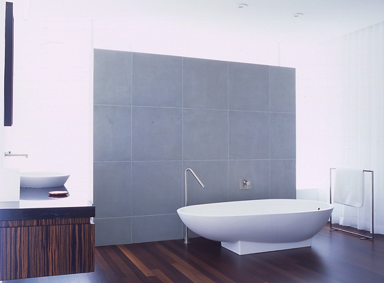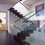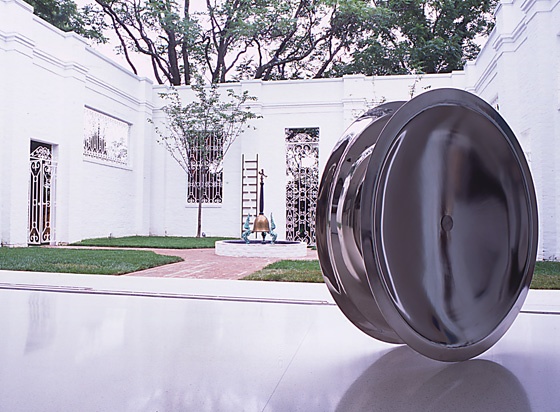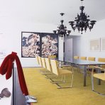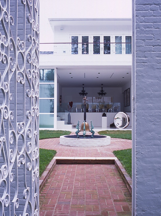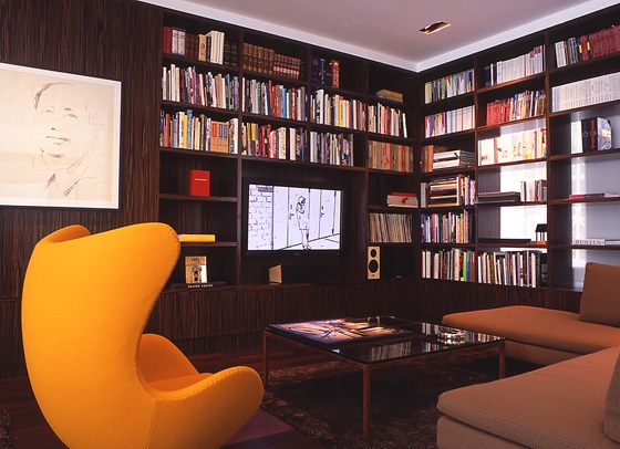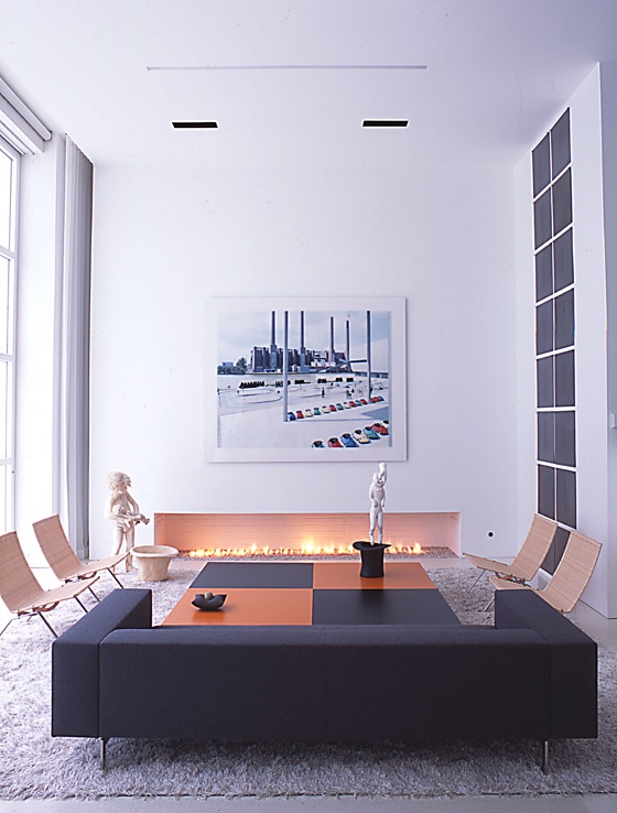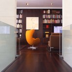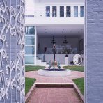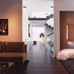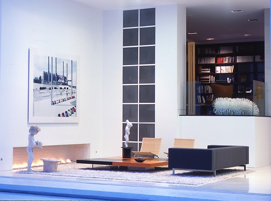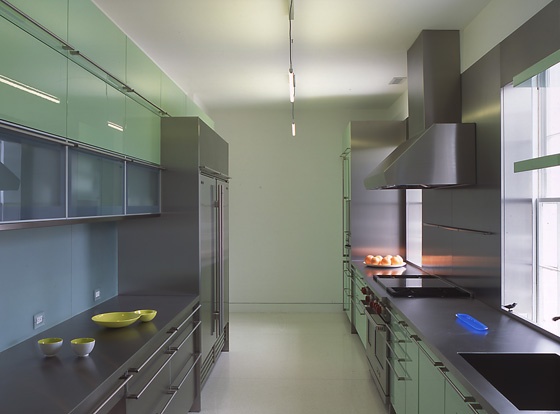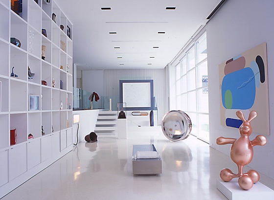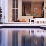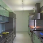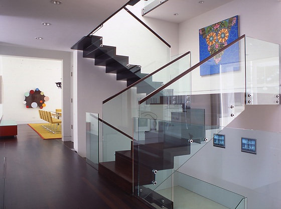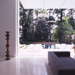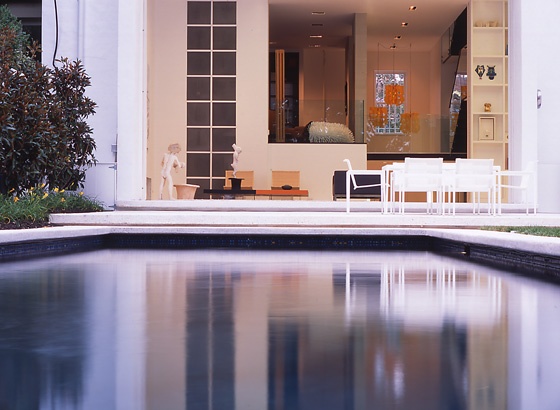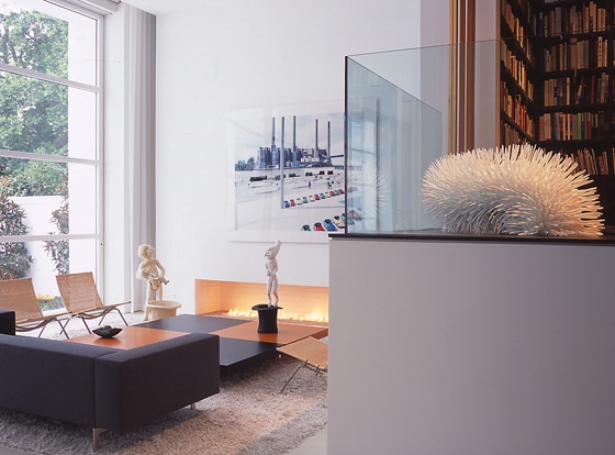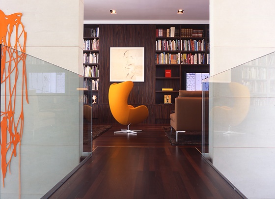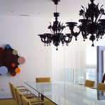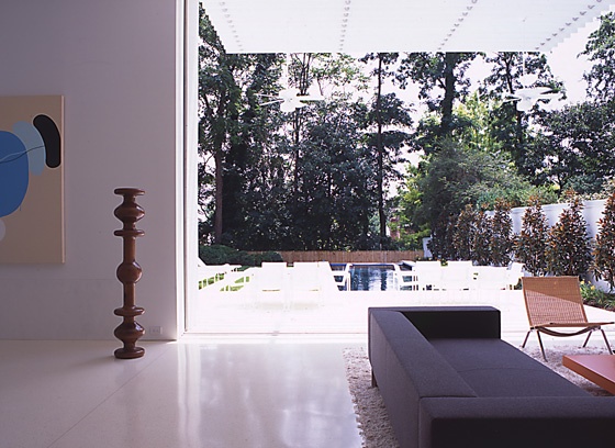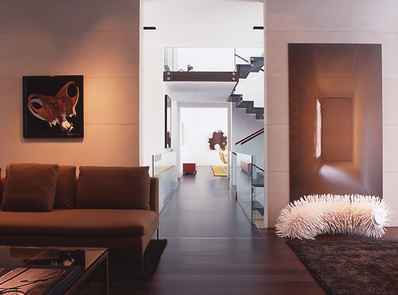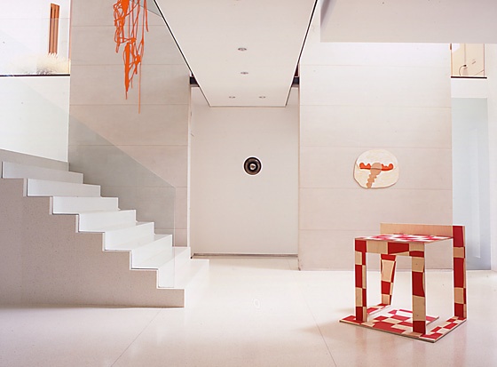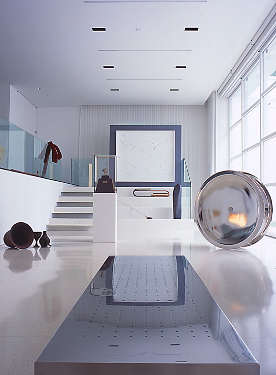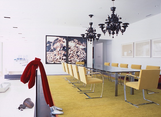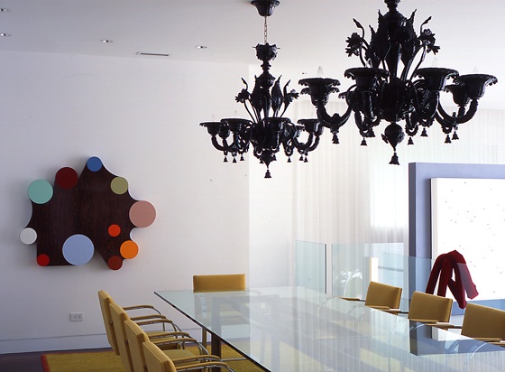 In the living room, Thrasher arranged Poul Kjaerholm wicker chairs, and a Baron & Baron sofa covered in wool flannel around a playful lacquered table that is actually four tables in one. Showing further the extent of his deftness for mixing all manner of styles, the stainless steel works of art in a 15-foot-high gallery are as comfortable in their surroundings as are Murano glass chandeliers, a Carlo Scarpa glass-topped table and Ludwig Mies van der Rohe's Brno chairs in the dining room. The chartreuse upholstery on these chairs echoes the perky tones in the Odegard carpet, an intended punch of color says Thrasher: "Colors and textures are important in a house like this, so it doesn't feel austere." Austerity is also held at bay by rich limestone, zebrawood, leather and wengé, proving that contemporary doesn't have to be cold.